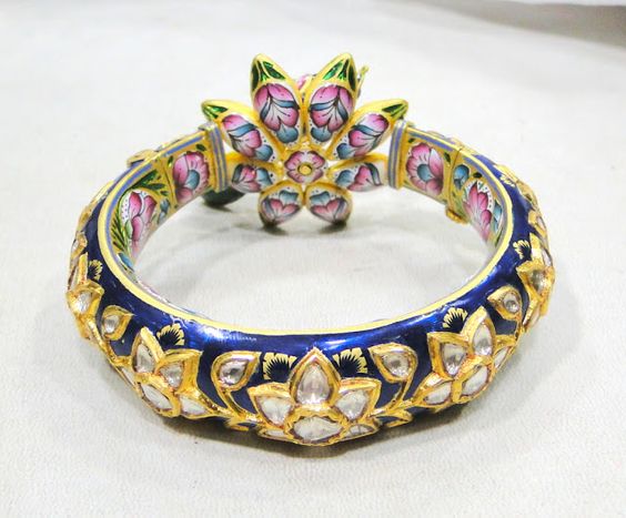 Meenakari refers to the enamel work done on a metal surface. It is namely used on the reverse side of Kundan and Polki jewels. The word “Meenakari” means “art of enameling” (Meena = enamel ; kari = art).