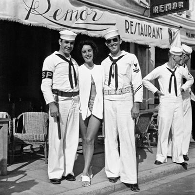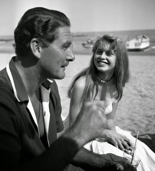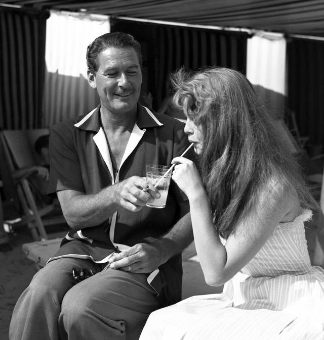 The French actress Brigitte Bardot and American actor Errol Flynn in Cannes in 1953 :