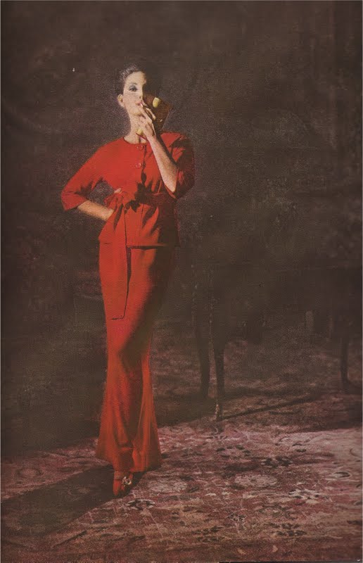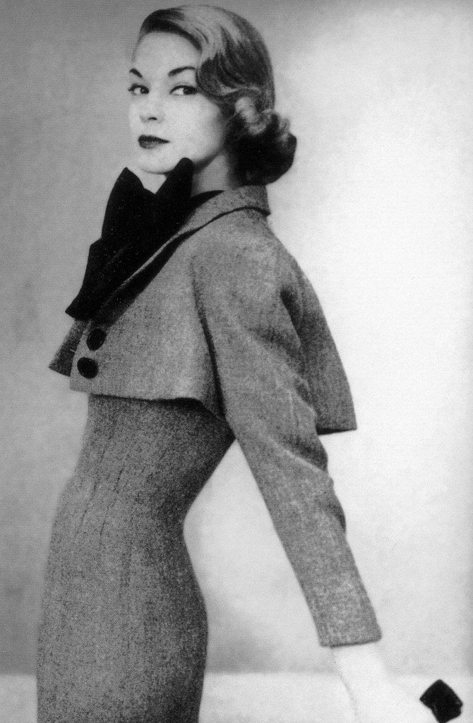 Model wearing a bell tunic suit by Norman Norell for Vogue 1957