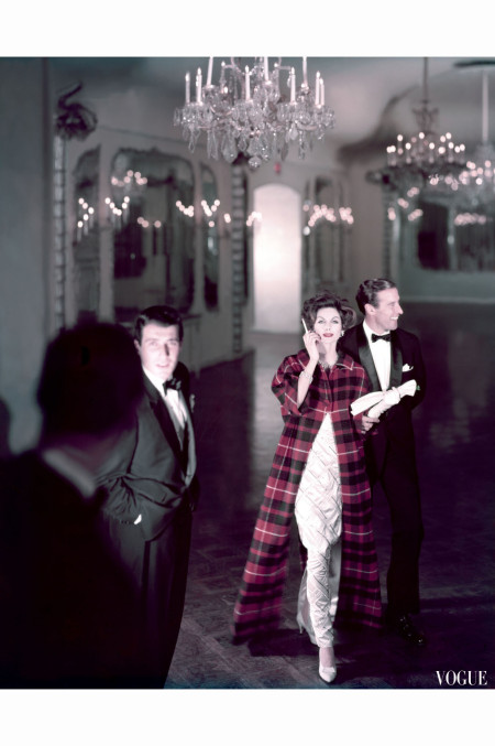 Suzy Parker wears a voluminous bow tied coat by Pertegaz for Vogue March 1954