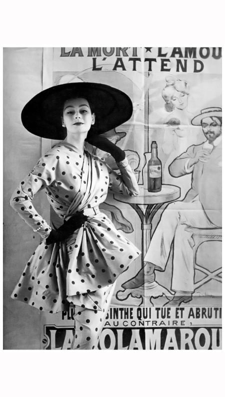Madame Grès (1903-1993). Robe du soir. La robe gitane moule le buste et les hanches puis s’évase en double corolle. Mousseline rouge à pois blancs de Lajoinie. Bijoux de Schneider. Gants d’Hermès. Paris, printemps-été 1955. Mannequin : Enid Boulting. Photographie d’Henry Clarke (1918-1996), publiée dans Vogue France, avril 1955, pp. 73-74. Galliera, musée de la Mode de la Ville de Paris. Dimensions : 6 x 6