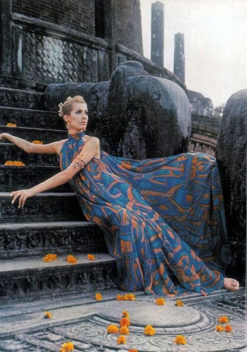 ca. 1967, Udaipur, India — Model Simone D’Aillencourt posed inside the Lake Palace in Udaipur, in a swirled flame-print poncho and jewel-cuffed pants by Emilio Pucci. — Image by � Cond� Nast Archive/Corbis