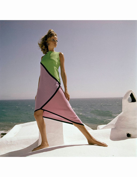 At the ocean side, the model, Veruschka, wearing an asymmetrical cotton jersey dress in geometric shapes of green, lavender, pink and black *** Local Caption *** Veruschka;