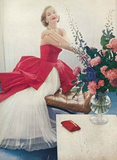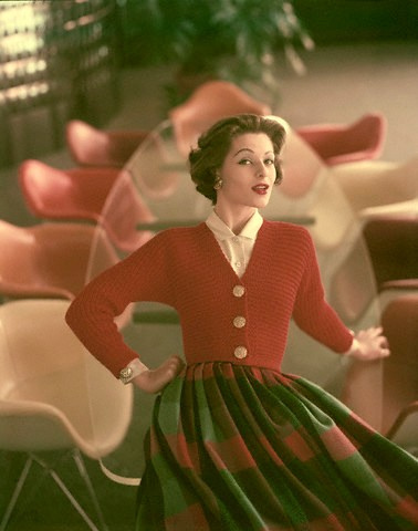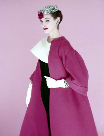 ca. March 1960, New York, New York, USA — Model wearing pale linen dress and red French linen jacket, by Donald Brooks, turquoise Brania necklace, Scaasi earrings, and Revlon makeup. — Image by © Condé Nast Archive/Corbis