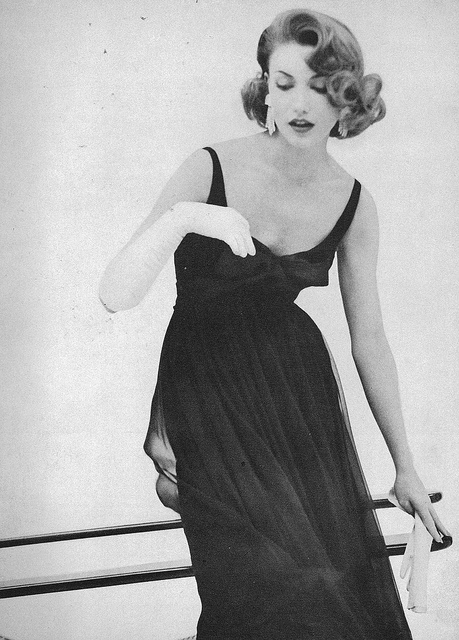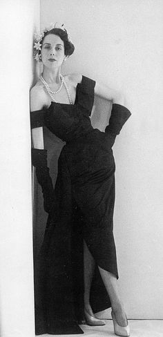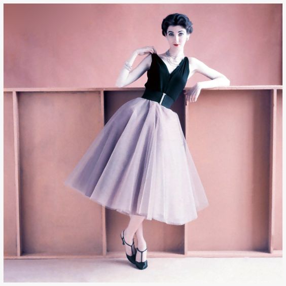 Model in sleeveless black jersey evening blouse and tulle dancing skirt above taffeta underskirt, 1952