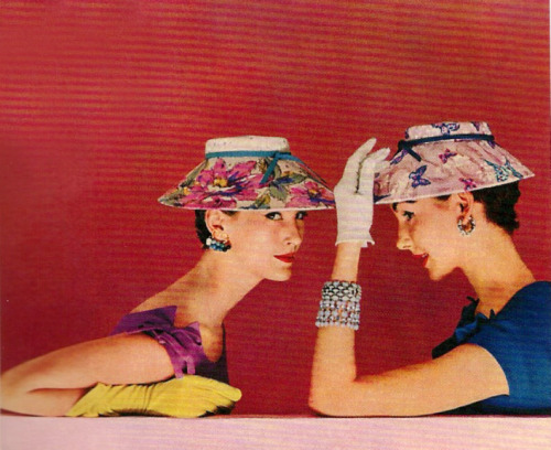 Two models wearing red dresses and playing cards, 1954