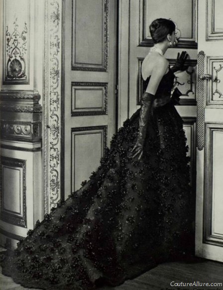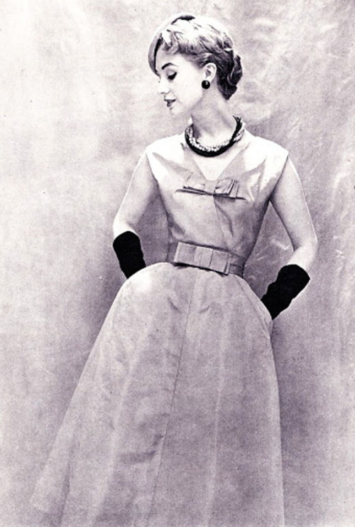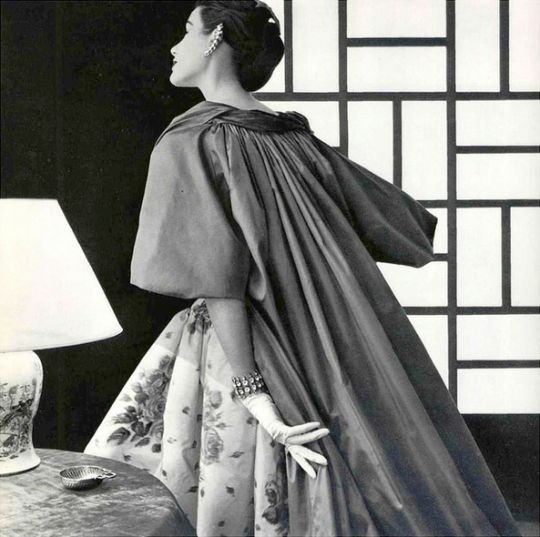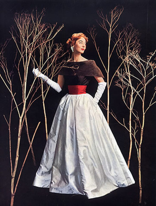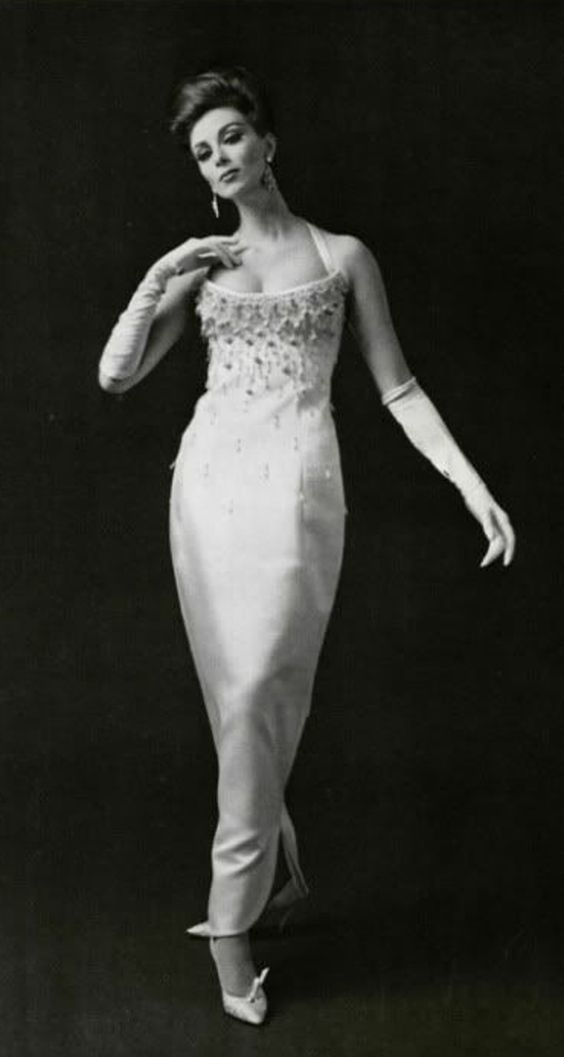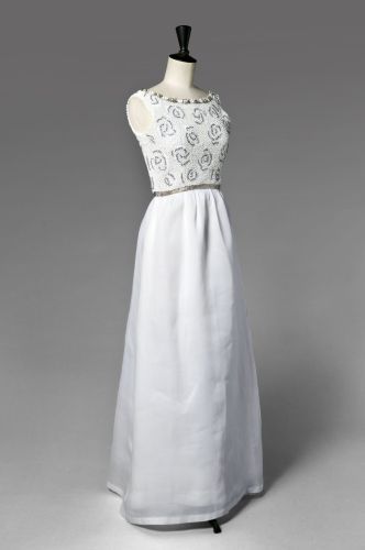 Jean Patou (1887-1936). Robe du soir en super-organza blanc de Bianchini-Férier avec des broderies d’argent et de cristal. Printemps-été 1954. Mannequin : Ann Nutting (Ann Gunning). Photographie d’Henry Clarke (1918-1996), publiée dans Vogue France 1954, page 104. Galliera, musée de la Mode de la Ville de Paris. Dimensions : 6 x 6
