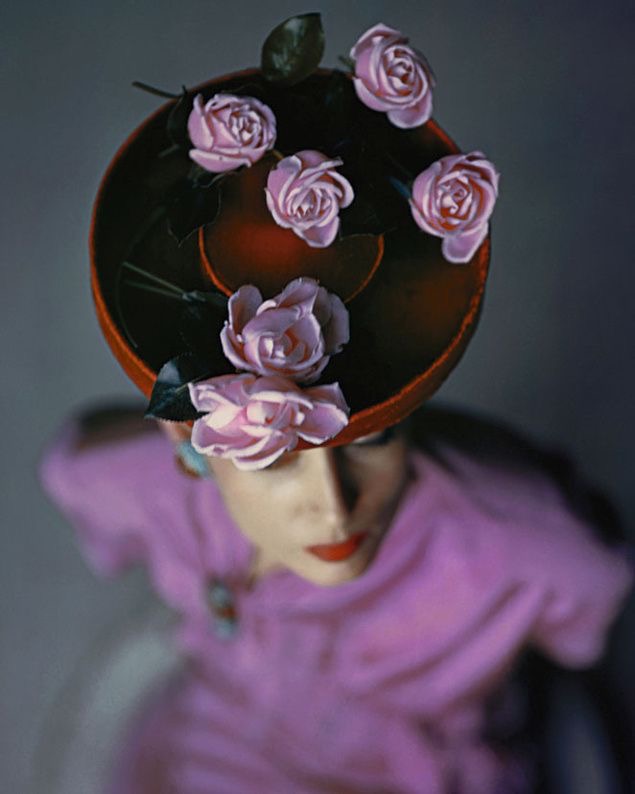 Meg Mundy in chartreuse felt hat with roses and hummingbirds, purple gloves, and purple veil and ribbons Vogue 1941