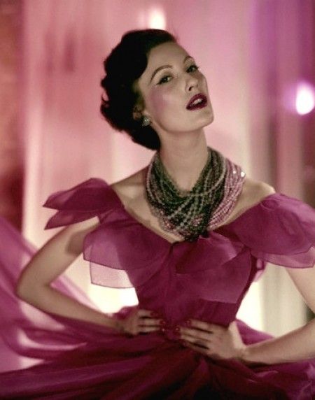 Suzy Parker wears a strapless white chiffon dress, its Empire waist banded with rhinestones, paired with the gloves are emerald green by Jacques Griffe, Vogue October 1953