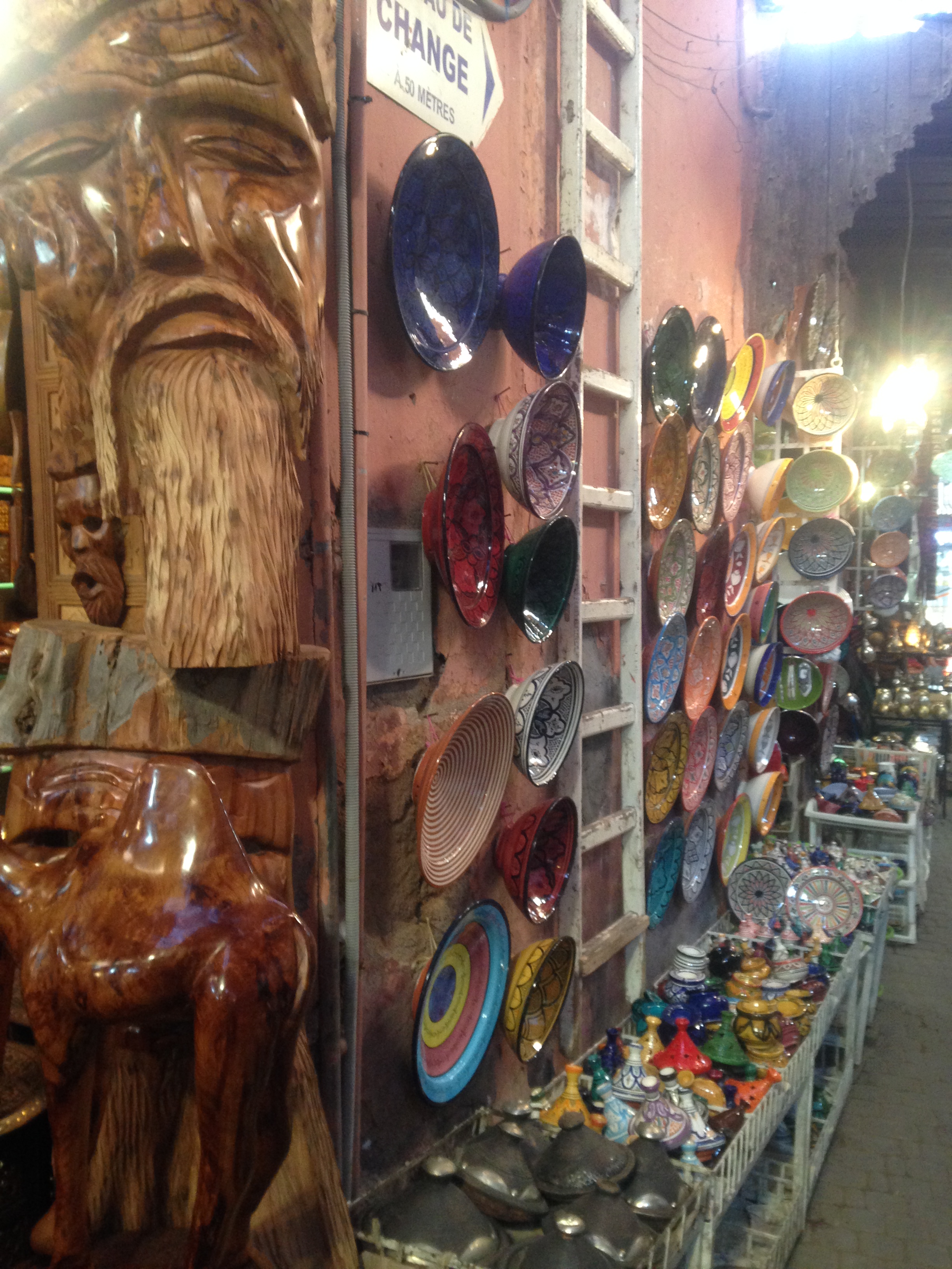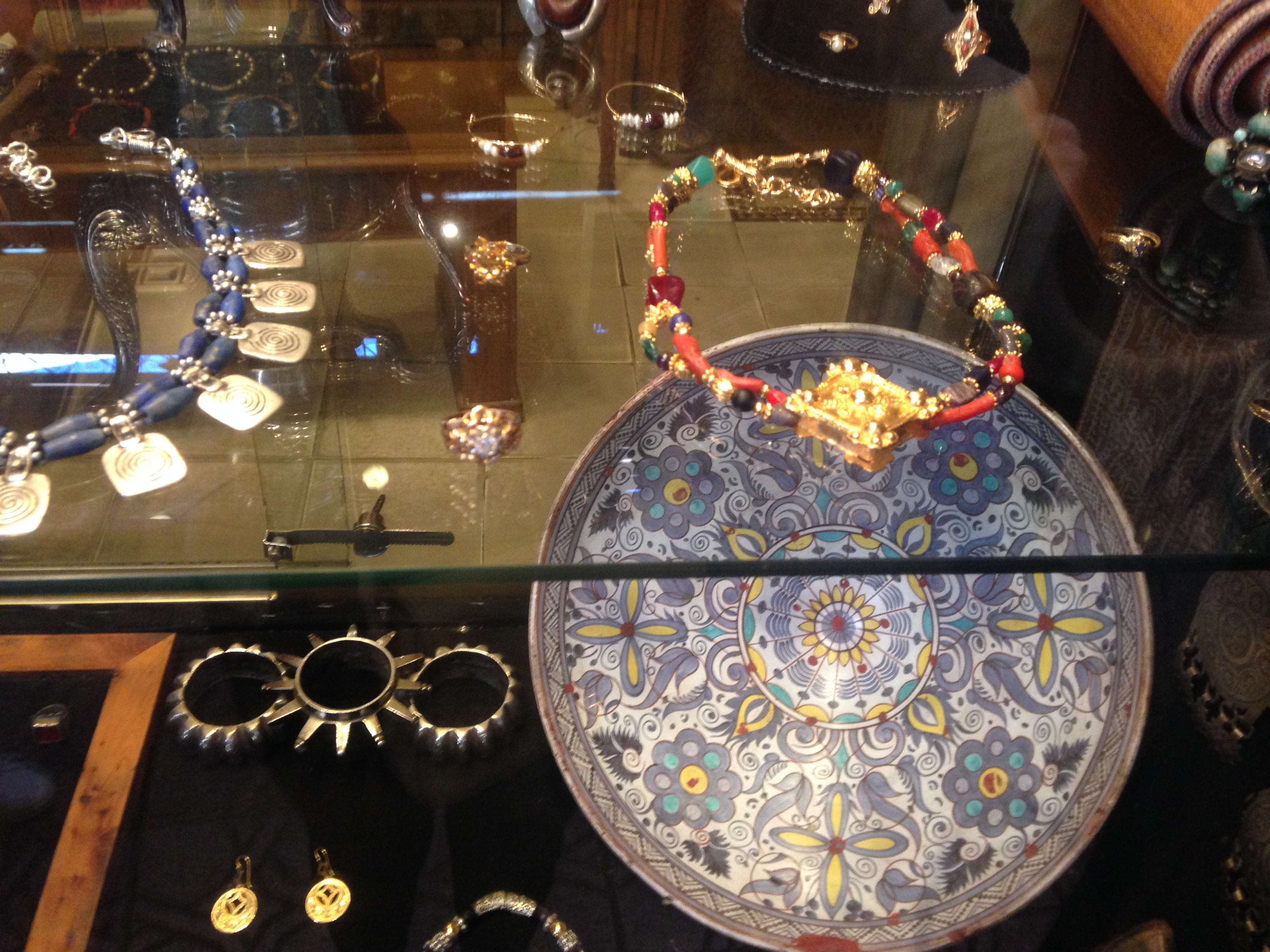 Walking in the souks of Marrakech is a pleasant change of scenery. The souks means in Arabic “markets”. It is very lively and colorful. It is a myriad of tiny streets, a real labyrinth ! There are various souks ; each souk is specialized in one type of products (tannery, slippers, blacksmiths, carpets…). About 40 000 artisans work in the souks ! We can found everything there : craft, leather, pottery, jewelry, spices, clothing, slippers… In the souks, i discovered the wonderful jewelry shop “El Abidi Nasser Eddine”. The founder sells and buys antique Berber jewels.